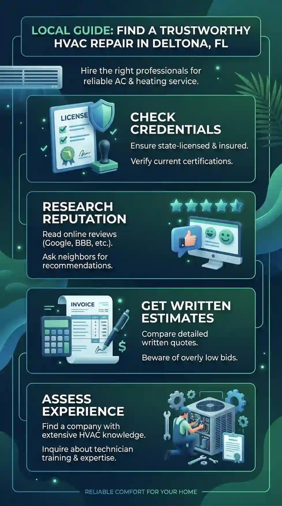 Finding a trustworthy HVAC company in Deltona comes down to verified credentials, transparent communication, and knowing what honest work looks like in Florida's regulated contracting market. Here's what matters most:
